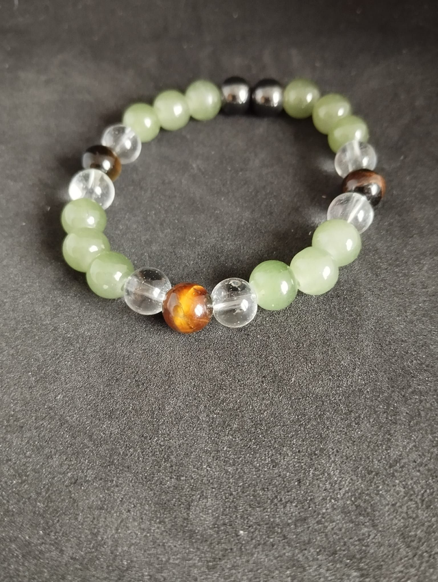 Ce bracelet en pierres naturelles associe harmonieusement l’aventurine verte, le quartz blanc, l’œil de tigre et l’hématite, créant un bijou aussi esthétique qu’équilibrant sur le plan énergétique. L’aventurine, pierre de chance et d’optimisme, apporte une énergie douce, apaisante et réconfortante. Elle favorise l’harmonie émotionnelle, aide à relativiser et encourage une attitude positive face aux changements.