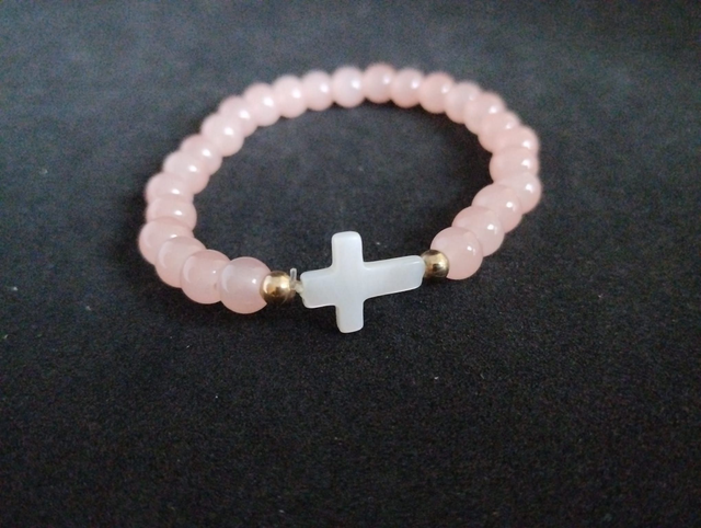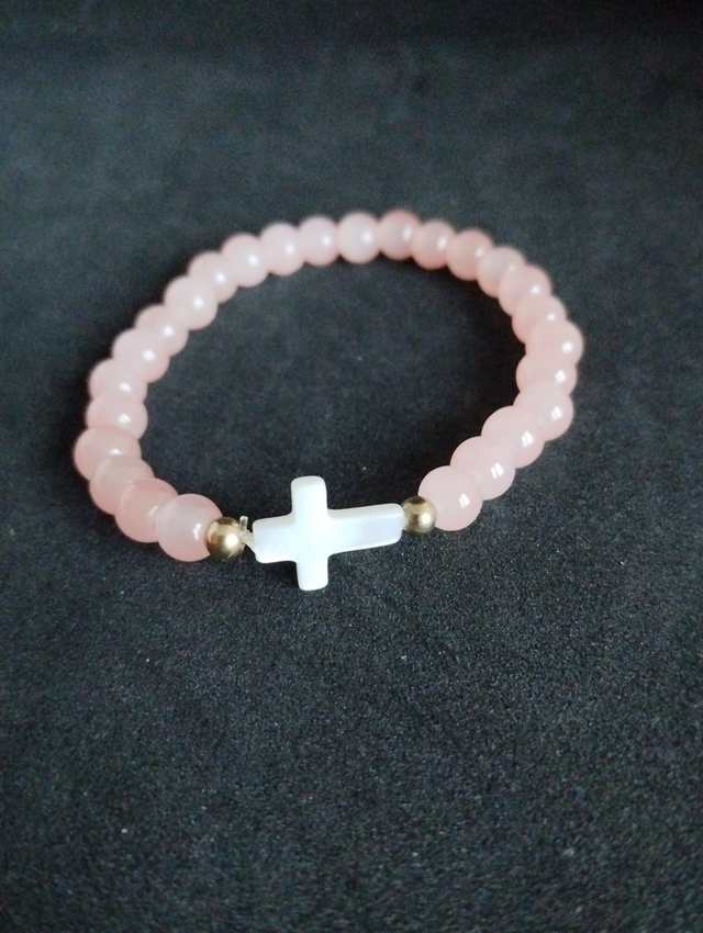 🤍 Bracelet en Quartz Rose & Croix en Nacre 💗