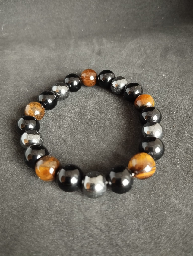 Ce bracelet puissant associe trois pierres incontournables de protection et de stabilité : l’hématite, l’œil de tigre et l’obsidienne.